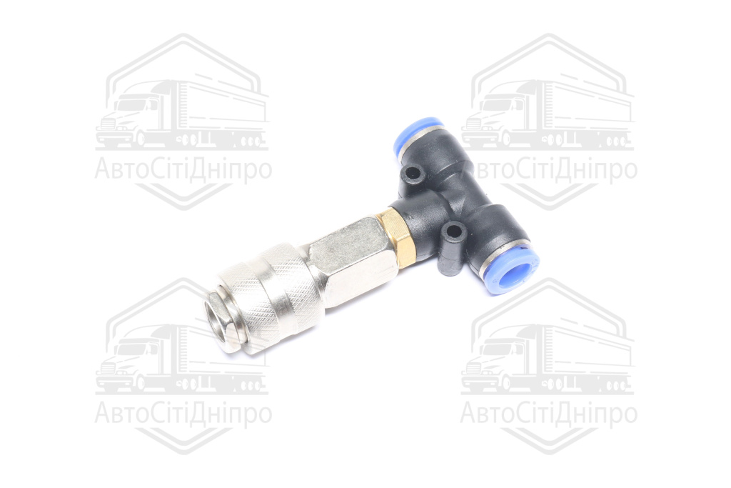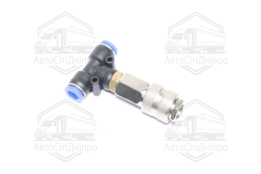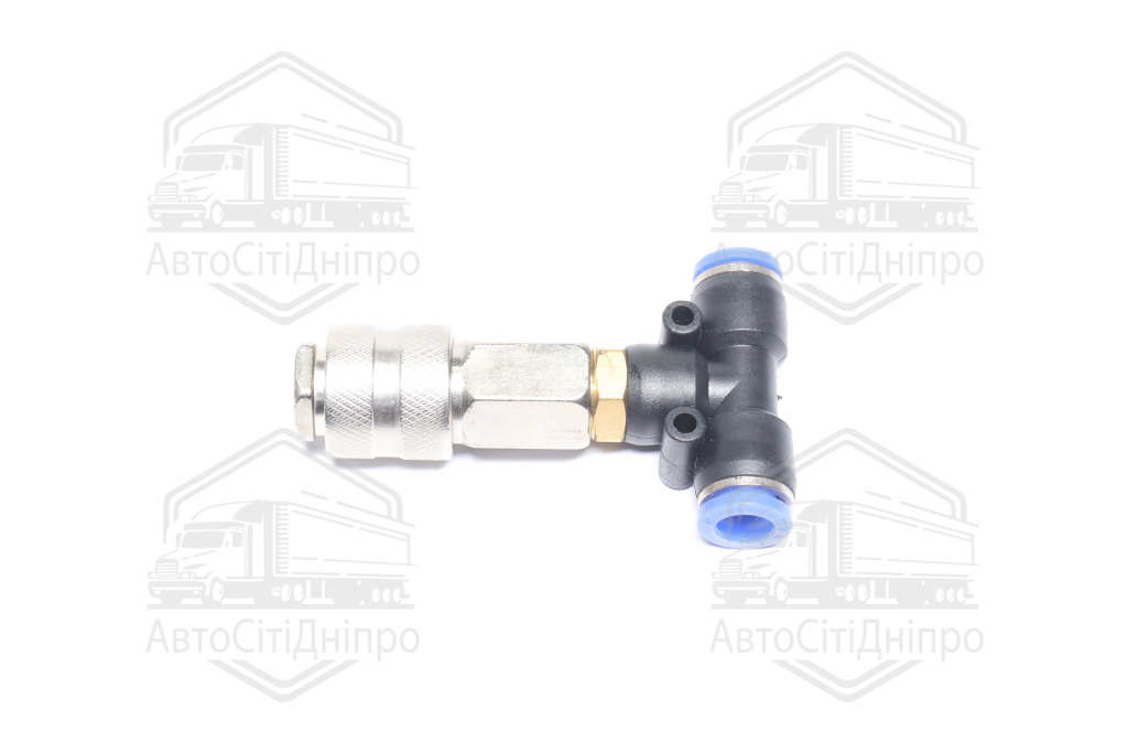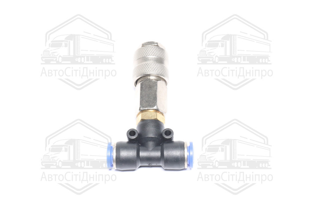 З'єднувач пневматичний D8-8 цанговий-куплунг Т-подібний мама пластик-сталь (RIDER)