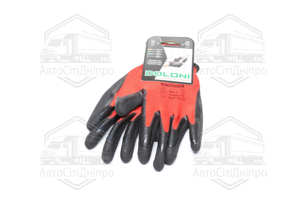 Рукавички трикотаж, червоні, поліестер, в'язаний манжет, латекс, розмір 10 (DOLONI)