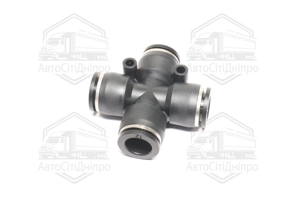 З'єднувач пневматичний цанговий Х- подібний 12х12х12х12 пластиковий (2 отвори кріплення по прямій лі